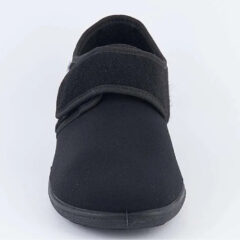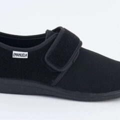 Scarpe ultracomode Emanuela con la tomaia costruita con un tessuto elastico che avvolge il piede modellandosi come un guanto, mentre la parte posteriore della tomaia è formata da un tessuto più resistente per dare maggior sostegno. Il fondo è in gomma vulcanizzata con tacco interno in sughero e riempitivo in feltro ottenuto da fibre vegetali. Chiusura regolabile con velcro.