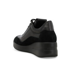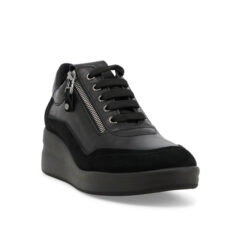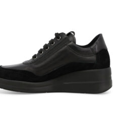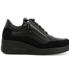 Questa sneakers di Melluso, che ricorda il modello di Rucoline, è facile da calzare grazie ai lacci regolabili la zip e gli elastici che consentono il massimo comfort. La tomaia è in nappa con profili in camoscio e la gomma è poliuretano. Il tacco è 4 cm con un plateau di 2 cm. Il plantare è estraibile , realizzato con materiali riciclati, in tessuto traspirante e anallergico, sostituibile con un plantare su misura.